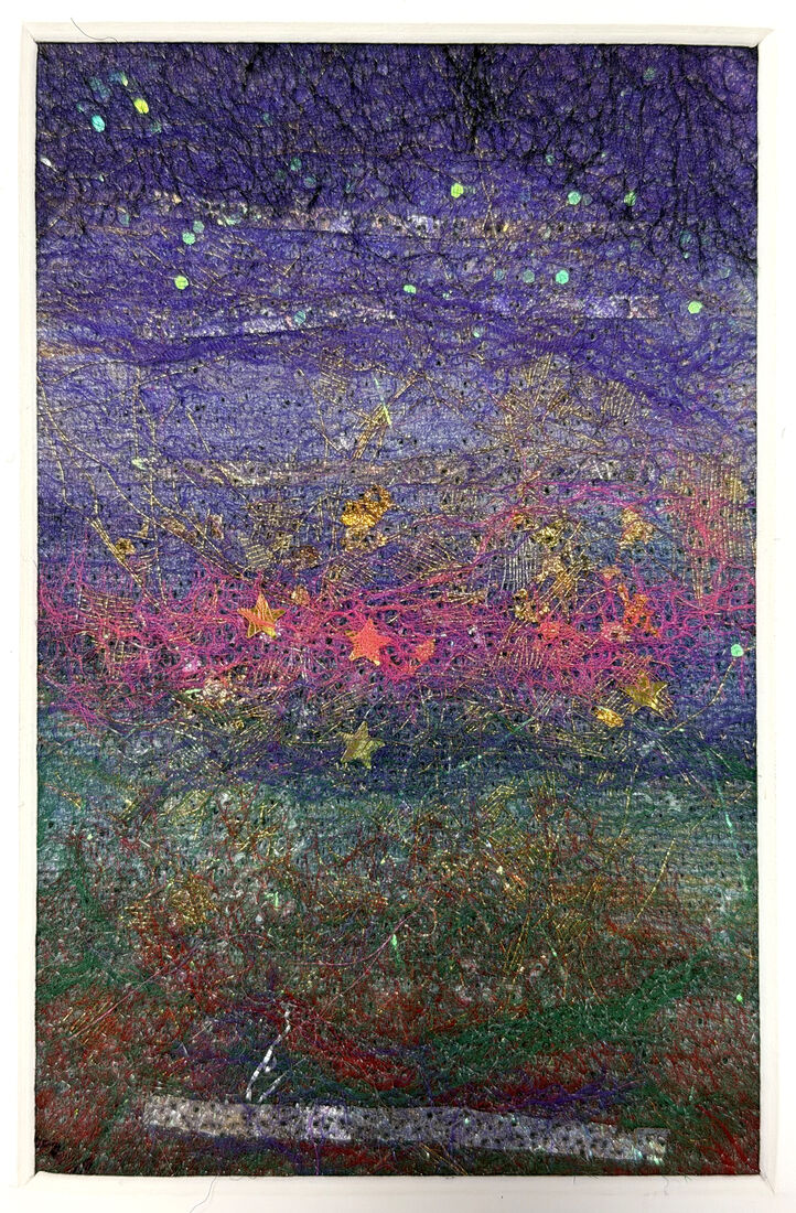 I made this piece in during lockdown. We have the most wonderful sunsets here, changing minute by minute, and fleeting. Our landscape here constantly inspires me. This small embroidery is a small 'sketch' of a sunset, made purely for fun.